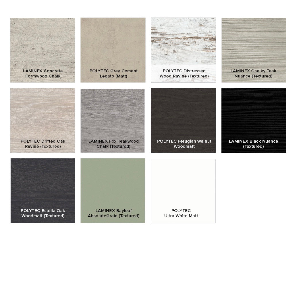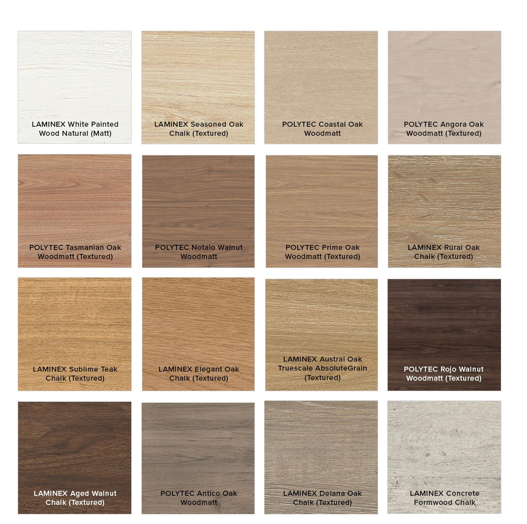 - Select from 22 woodgrain melamine or white finishes