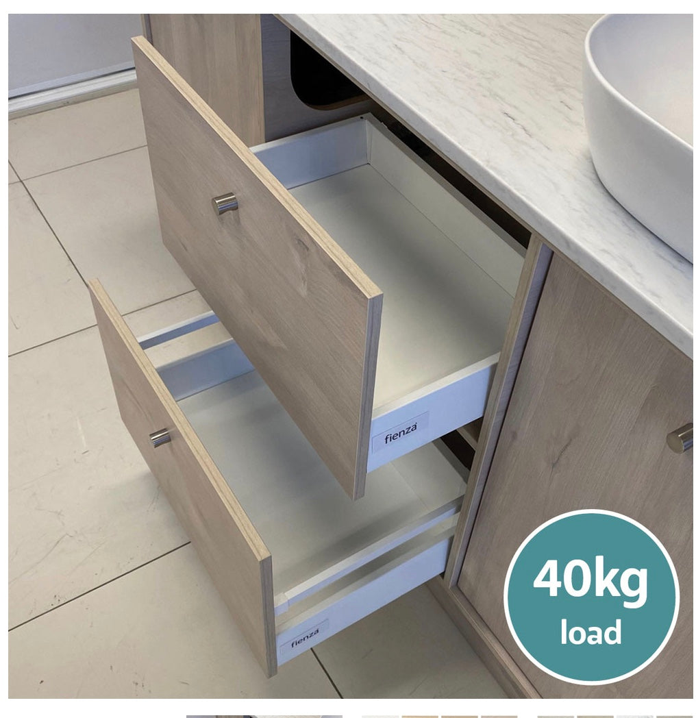 - ‘Confident close’ drawer damping system combines smooth, fast closing with late deceleration to provide a quiet landing on close