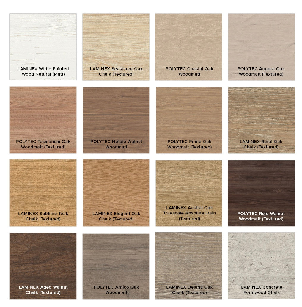 - Select from 22 woodgrain melamine or white finishes