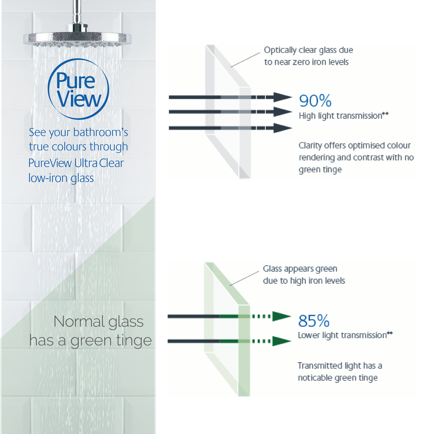 This superior “Low-Iron” Pureview Glass brings to your bathroom the natural colours, sharpness and enhanced clarity that high-definition TV brings to your living room.