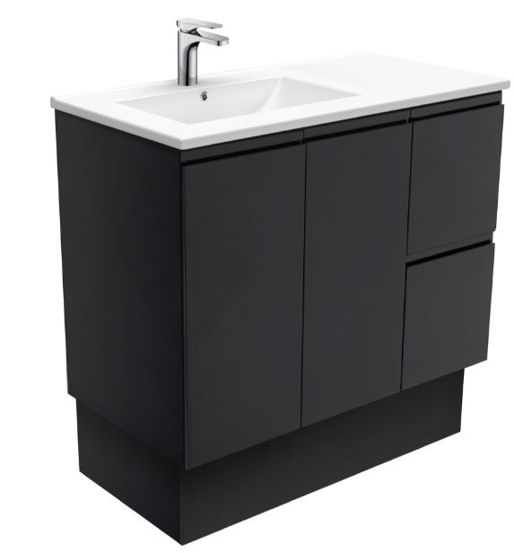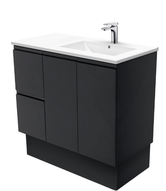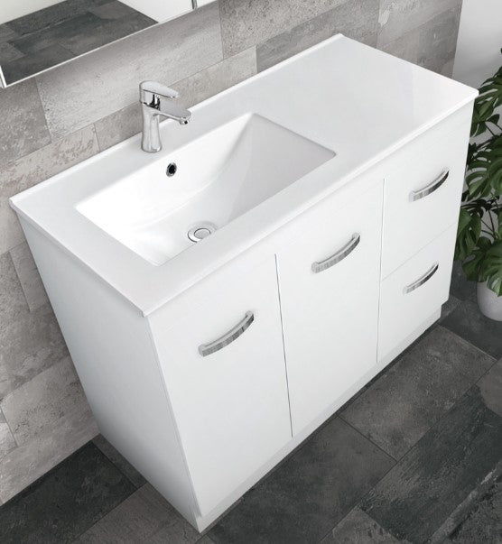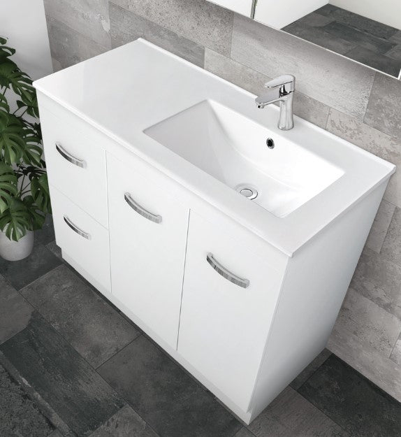 The Dolce 900 Offset vanity range features a unique offset bowl design with left-hand or right-hand options.