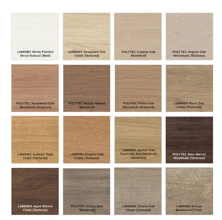 - For woodgrain finishes: shelf, interior and sides with horizontal direction